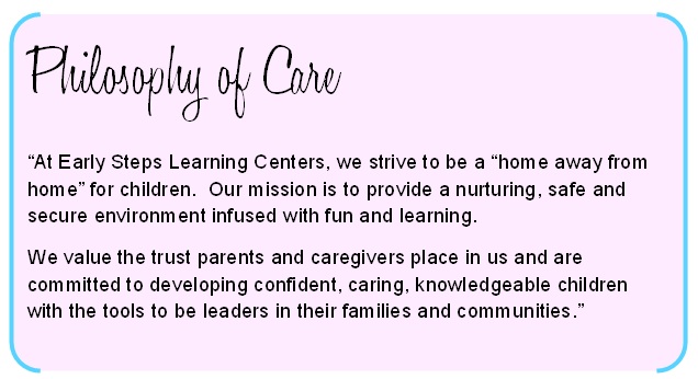 Our managers and staff follow this Philosophy of Care in all that they do at Early Steps Learning Center. We are proud of our two locations, our staff, and our programs. We are blessed to be an important part of the development and care of so many local children.